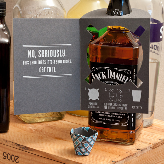 The very first card that allows for immediate celebration no matter the occasion. Each card doubles as a functioning shot glass that is assembled origami-style without any additional materials. They hold about 1oz of liquid without leaks for hours (not that any shot has ever sat in a glass for more than a few seconds).
